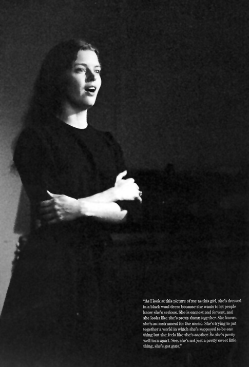 Caption Reads: "As I look at this picture of me as this girl, she's dressed in a black wool dress because she wants to let people know she's serious. She is ernest and fervent, and she looks like she's pretty damn together. She knows she's an instrument for the music. She's trying to put together a world in shech she's supposed to be one thing but feels like she's another. So she's pretty well torn apart. See, she's not just a pretty sweet little thing, she's got guts."  - Molly Scott